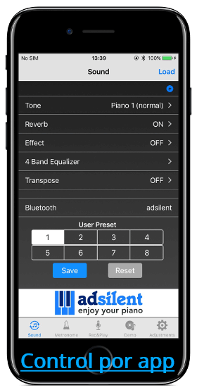 Adsilent es el sistema de silenciar su piano acústico más moderno para el montaje posterior a la compra. Desarrollado por expertos con gran experiencia en Japón y Europa, ofrece funciones y una fiabilidad únicas en su gama. Deseamos que disfrute de su sistema tocando el piano, practicando y componiendo, así como de muchas otras funciones y utilidades.