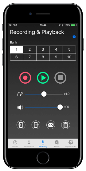 Botones de control para: tono, metrónomo, grabación, reproducción, volumen combinado / mando ON / OFF