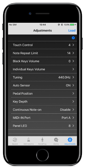 Configuraciones generales para: control táctil (dinámico), límite de repetición de nota, volumen de tecla negra, volumen de tecla individual, afinación, calibración automática